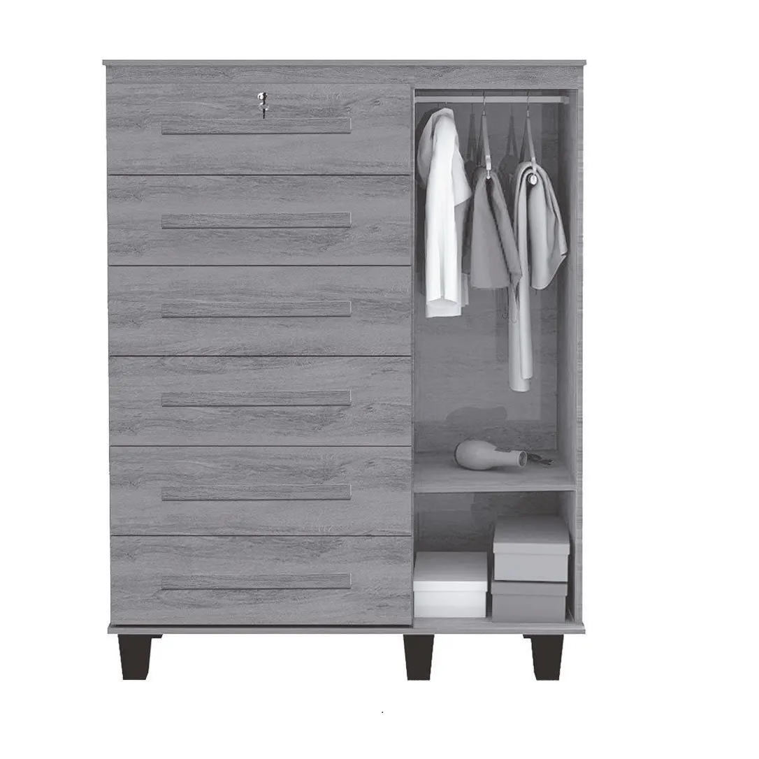 A Comoda Genova conta com 6 gavetas grandes, uma sapateira espaçosa com prateleiras mas que tem como opção um suporte para cabides